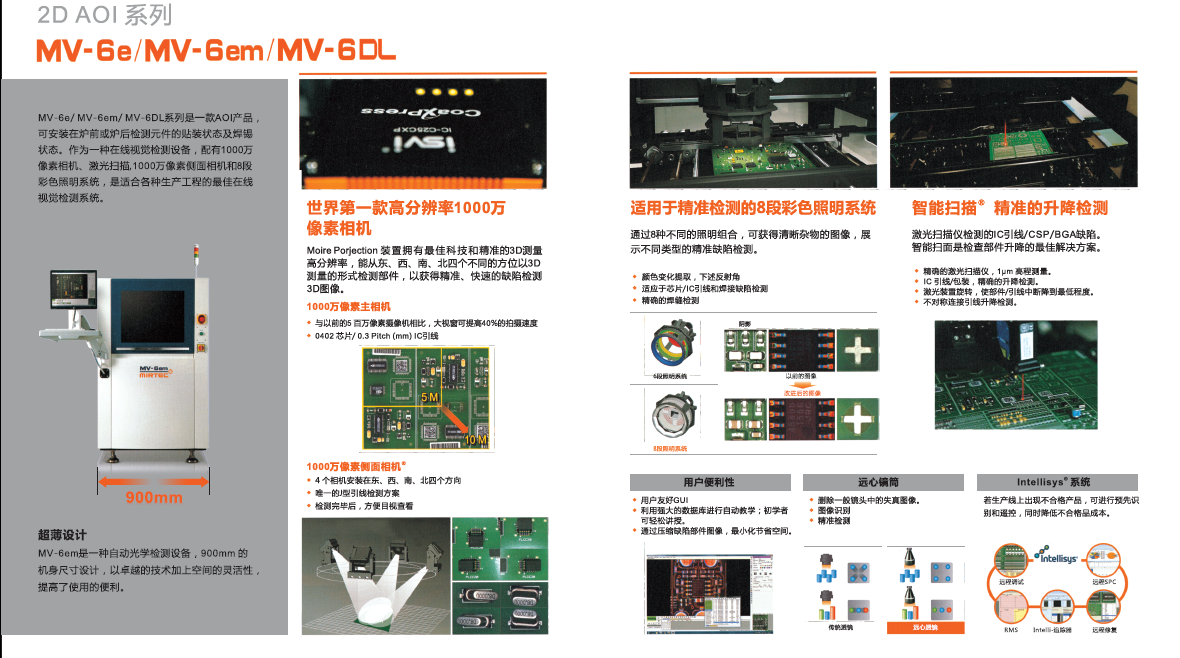 - 使用超高清1800万像素CXP相机和7.3㎛镜头,检测0201(㎜)配件 - 利用8段同轴彩光照明精密检测乱反射配件、光学字符识别、细微裂痕 - 高清1800万像素侧面相机 - 使用激光模块的IC引脚翘起检测,BGA封装翘起检查
